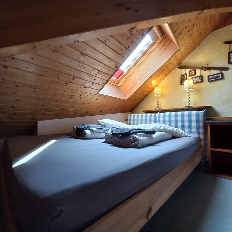 Une mezzanine avec lit double, 140x190 avec velux. Plafond bas, hauteur limitée