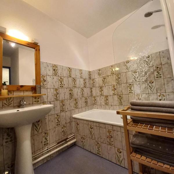 Salle de bain avec un bain et douche , sèche-cheveux. WC séparées.